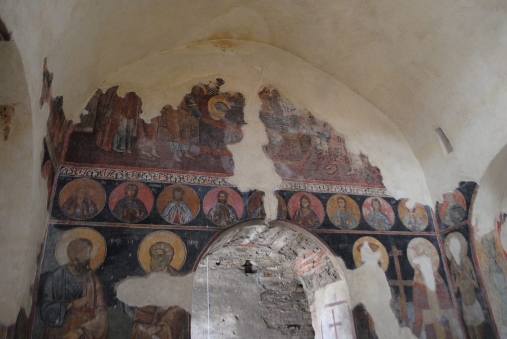 Живопис е имало само на втория етаж – в същинския храм, отвън, днес слабо запазена върху една от слепите ниши, и от вътре разположена в три пояса: долен, среден и горен с гръцки надписи. Сигурно това е първото и единствено изписване от времето на издигането на храма и то от добра школа. Запазеният гръцки надпис върху пиластъра, който бе описан по-горе се отнася сигурно до построяването на храма. В най-долният пояс имаме медальони с очертани вътрешно кръгли или квадратни вписани или тъмножълти полета, редуващи се един след друг. Фуниообразните ниши също са били изписани. От тази живопис личат още: Успение на Св. Богородица, над вратата девет бюста медальони (горният пояс), в долният пояс – Св. Св. Константин и Елена, от ляво на които е Свети Петър, а от дясно Св. Павел.