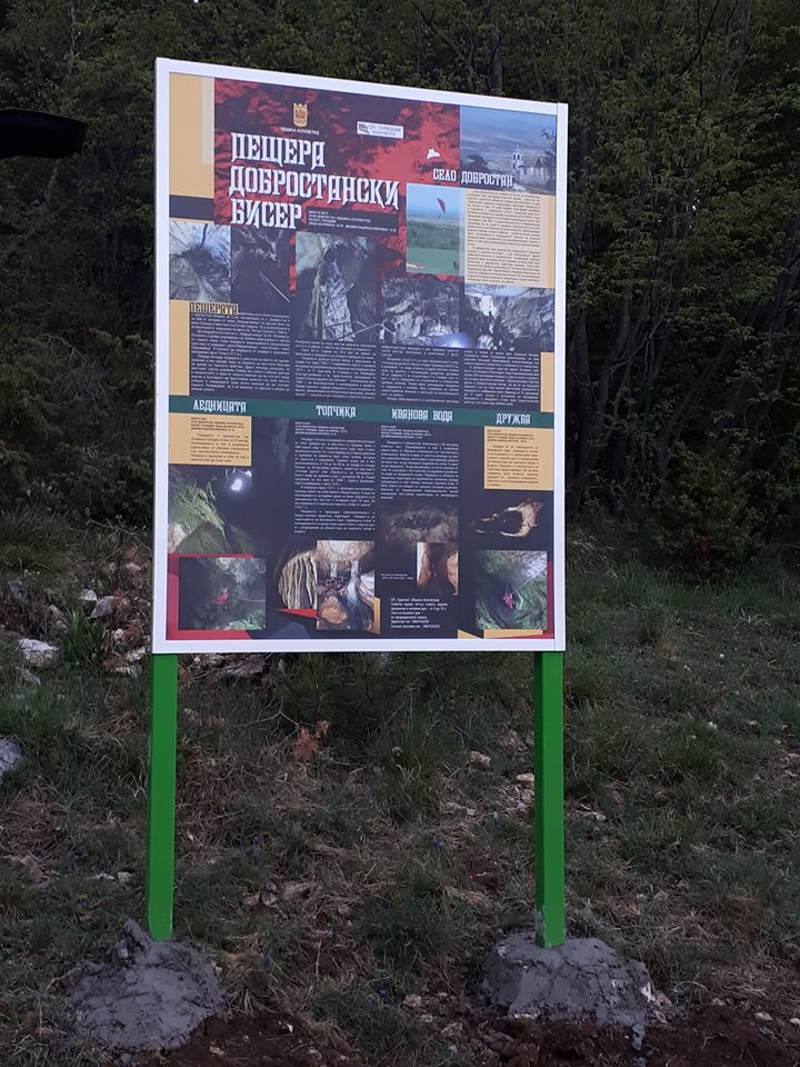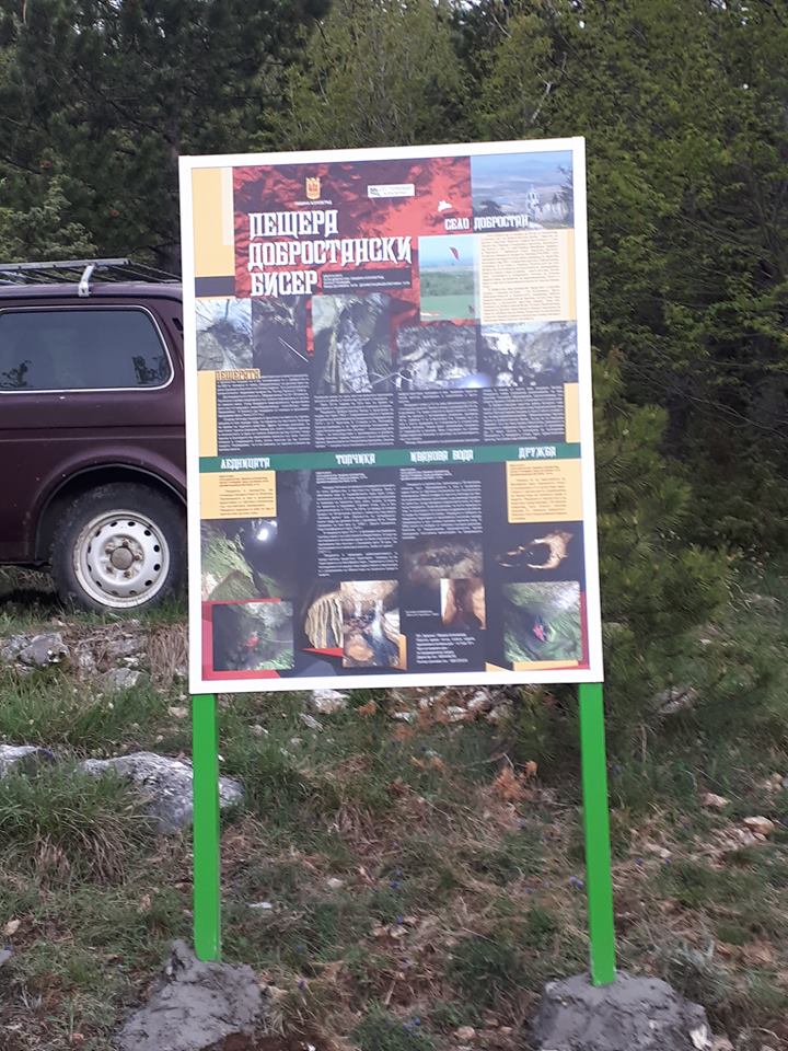 Днес поставихме две табели, които дават информация за пещерите в района на село Добростан. Табелите са на български и английски език, а основно внимание в тях е обърнато на пещера „Добростански бисер“. Информация има и за пещерите „Ледницата“, „Дружба“, „Иванова вода“ и „Топчика“.