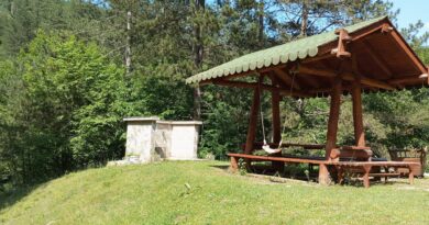 Достигате поредната беседка, която е разположена на малка поляна сред гората. Тук има и табела „Чешма“, която се намира до малък скален корниз, встрани от беседката, но не разчитайте на нея поради сезонния и характер.