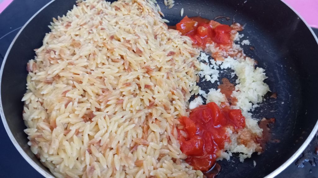 Запържваме 1 пакет (500 гр.) в малко загрято олио. Добавяме сол и малко червен пипер. След като арпата се запържи я отдръпваме в единия край на котлона. В празния край с преса смачкваме и добавяме 5-6 големи скилидки чесън. Запържваме чесновата каша, след което добавяме една консерва домати. Смесваме ги, оставяме ги да поврят малко заедно, след което смесваме арпа фидето с доматите и чесъна. Добавяме 200 ml. гореща вода, слагаме капак, намаляме печката и оставяме за около 10 мин на бавен огън.