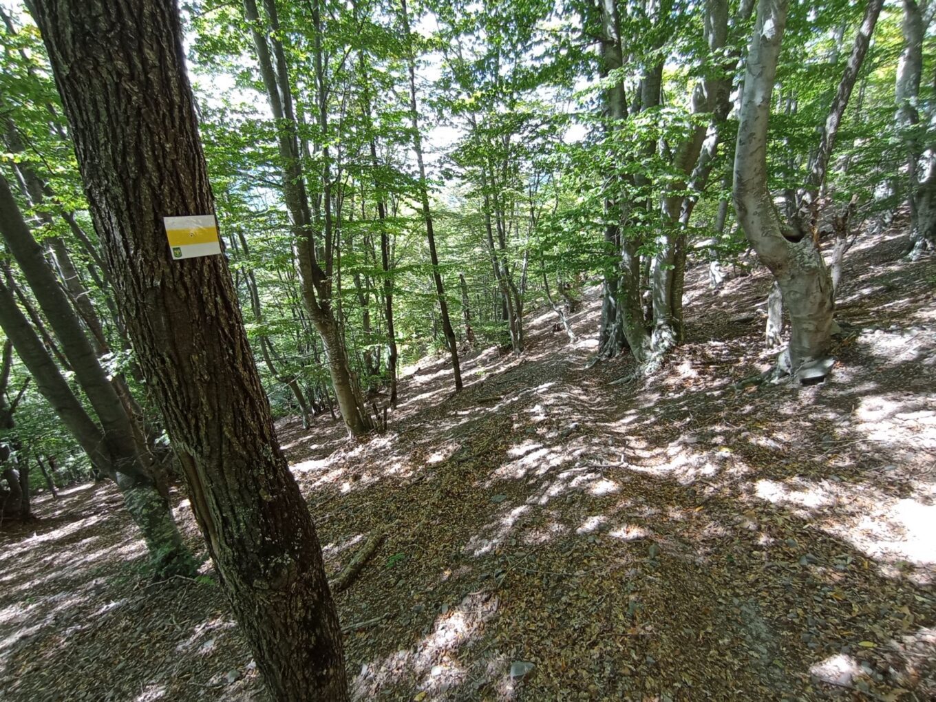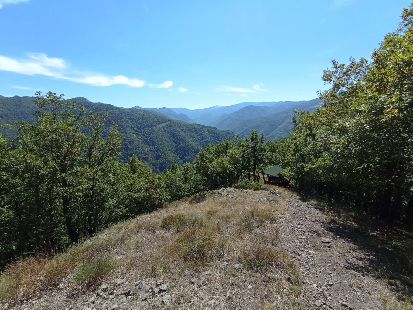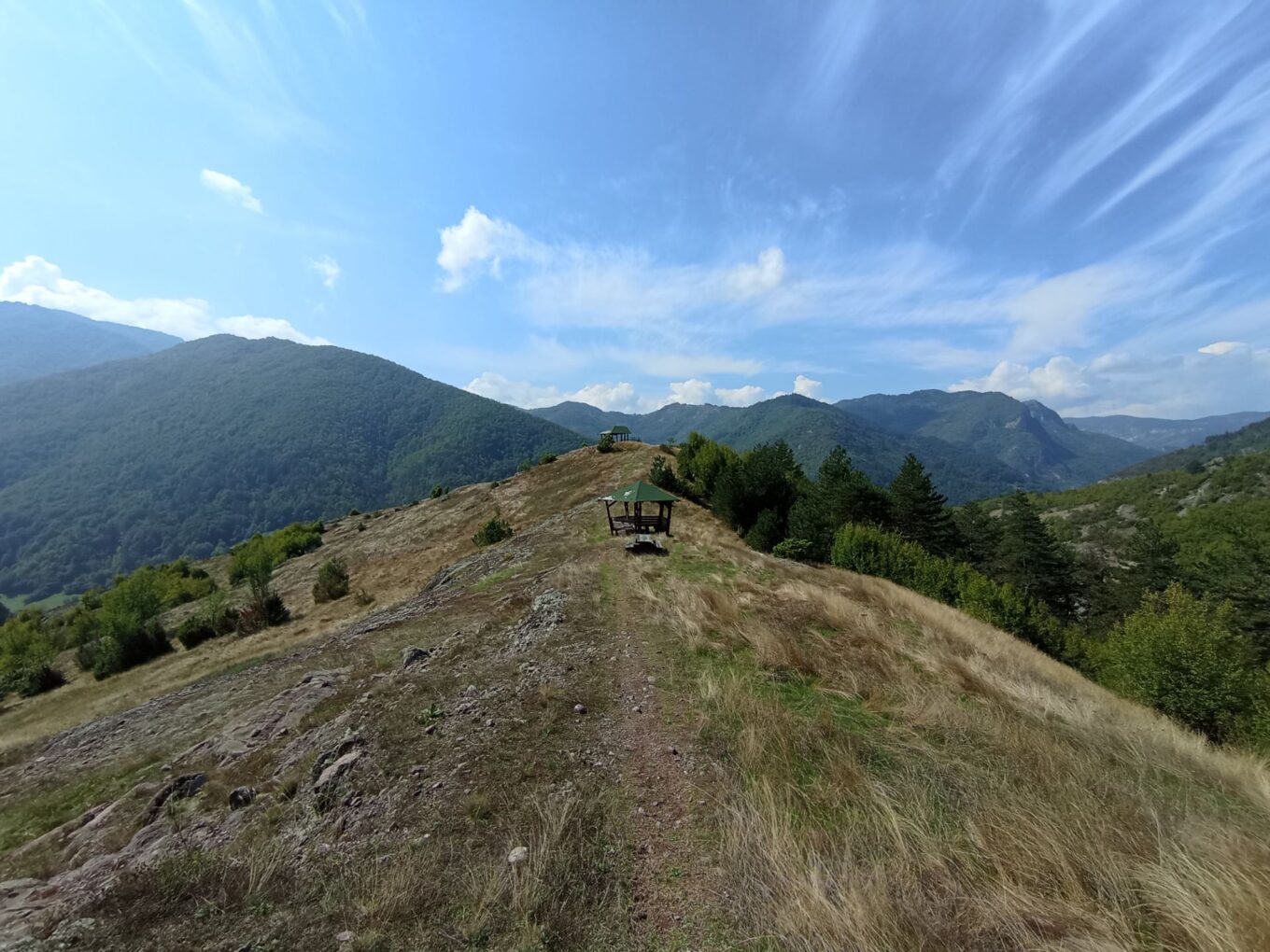 Намирате се на малък превал и започвате спускане. Следват поредните беседка и пейка с панорамен изглед. Намирате се на малко ребро, което започва да се развива стръмно в посока север. Сред бор и габър изкачвате солидна денивелация, а пътеката донякъде щади вашите сили, движейки се на големи и малки серпентини.
