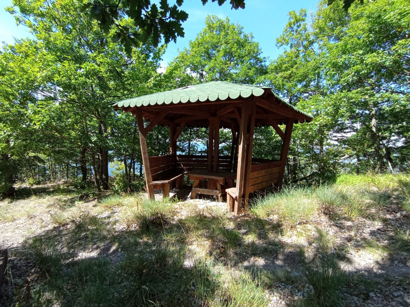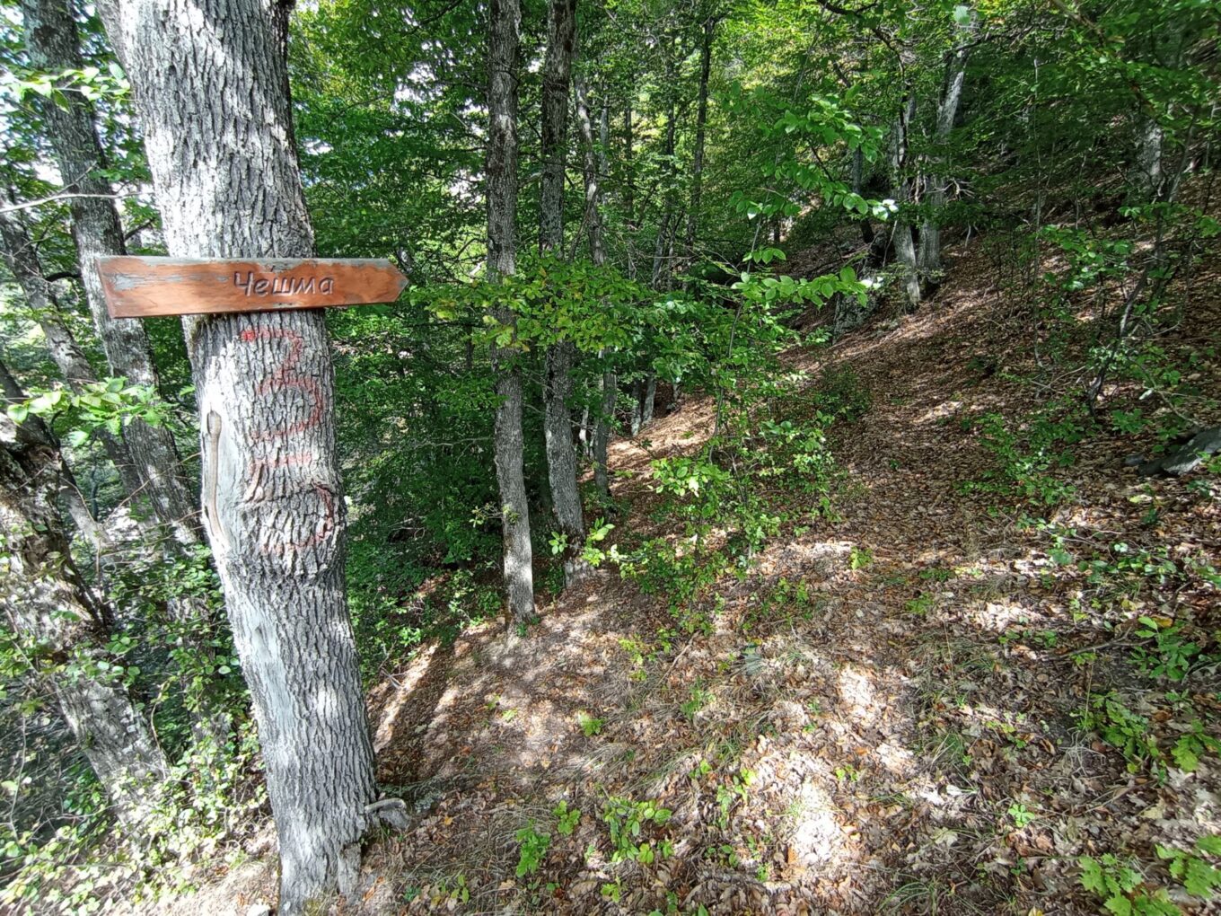Достигате поредната беседка, която е разположена на малка поляна сред гората. Тук има и табела „Чешма“, която се намира до малък скален корниз, встрани от беседката, но не разчитайте на нея поради сезонния и характер.