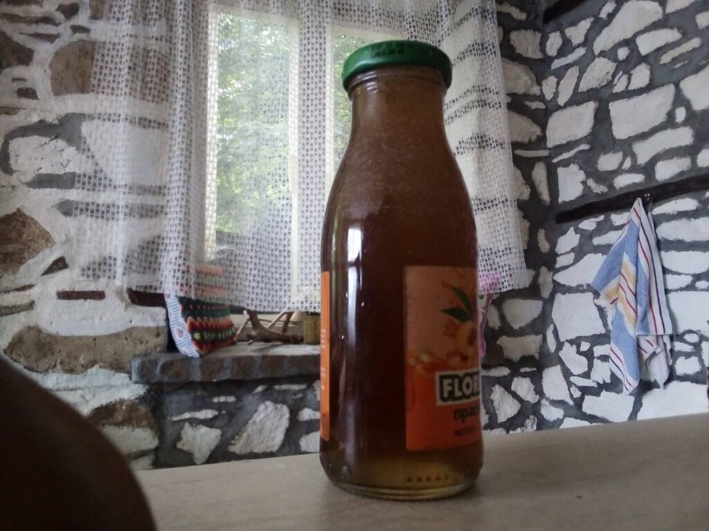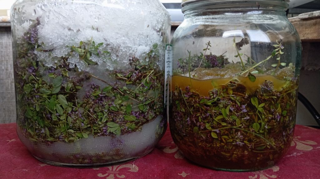 Затваряте и оставяте на слънце. Ние го правим на село, защото къщата ни на Джурково има слънчево изложение през голяма част от деня. За няколко седмици влагата от мащерката и захарта се сливат в една чудодейна субстанция.