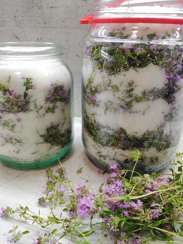 Затваряте и оставяте на слънце. Ние го правим на село, защото къщата ни на Джурково има слънчево изложение през голяма част от деня. За няколко седмици влагата от мащерката и захарта се сливат в една чудодейна субстанция.
