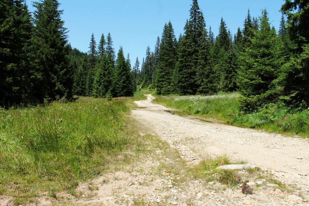 Достигате до голямо уширение, рампа за товар на дървен материал. Тук виждате как три малки ручея се събират и дават началото на заблатените участъци, които дават и името на екопътеката. Движите се край тях, а сянката на големите смърчове носи прохлада.
