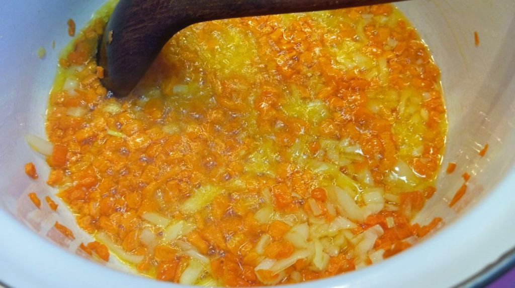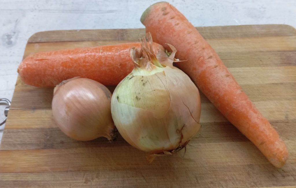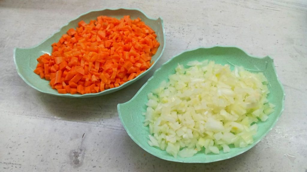 Докато текат „процедурите“ по първата и втората вода, нарязваме на ситно две глави лук и два средно големи моркова.