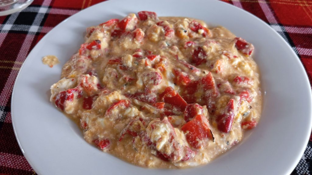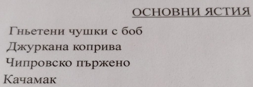 „Гньетени чушки“ вероятно се досещате са пълнени чушки. Аз обаче реших да хапна чипровско пържено. Оказа се много приятен омлет с обелени и нарязани печени чушки и сирене.