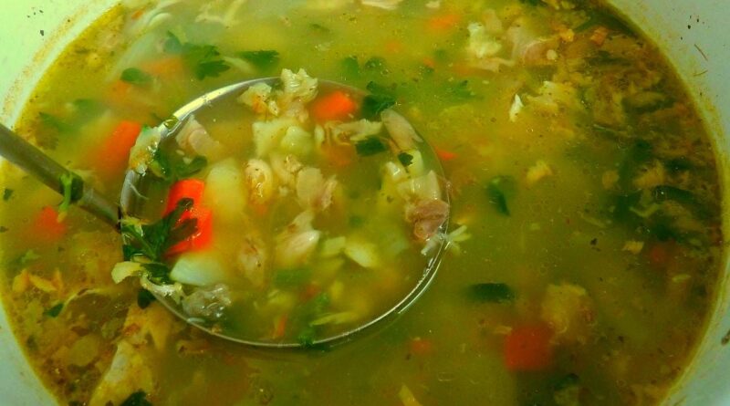 Оставяте всичко да ври около 30 мин., след което първо отцеждате бульона, почиствате и преглеждате добре рибата за кости, нарязвате на дребно сварените зеленчуци и отново слагате на печката. Добавяте изобилно количество магданоз, листа и стебла целина и девесил.