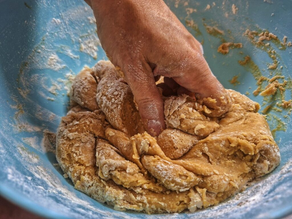Сместа се подготвя и се меси брашно. Разделяме в две найлонови пликчета и оставяме в хладилника за около 30 мин.