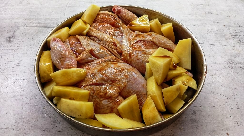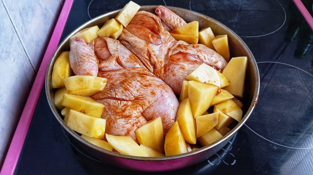 Взимаме две парчета пиле, правим едно харманче от червен пипер и олио и втриваме в месото. После нарязваме картофите на по-едри парчета (както съм ги нарязал на снимките) и ги слагаме в тавата. Посоляваме и объркваме всичко. Слагаме 100–150 мл вода и печем 20 минути на 220 градуса, после около 40 минути на 180.