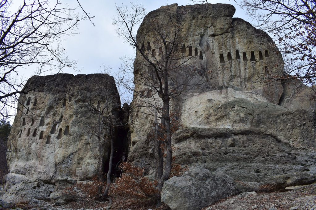 По стръмна камениста пътека слизате до тракийското скално светилище Пармак кая. Това е изключително интересно място, което представлява два слепени каменни монолита с десетки трапецовидни изсичания, а между двата слепени блока има добре оформена утробна пещера.