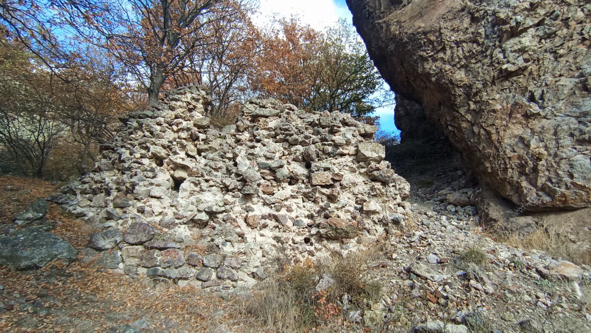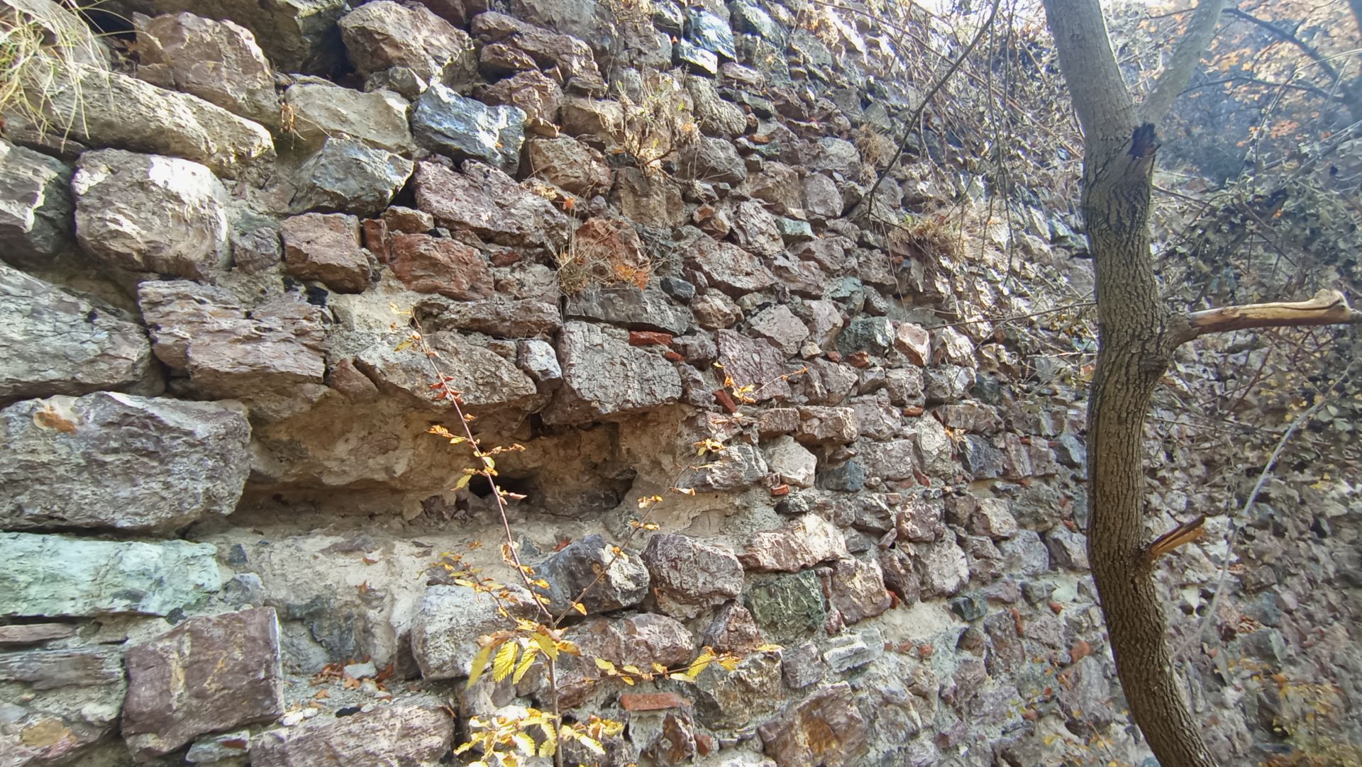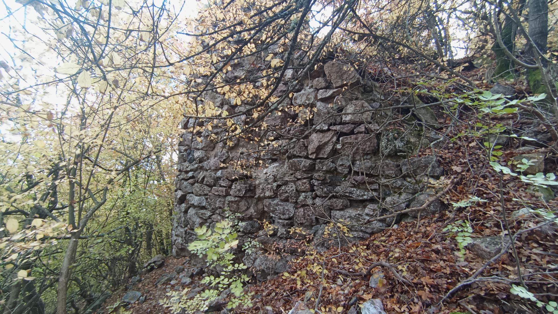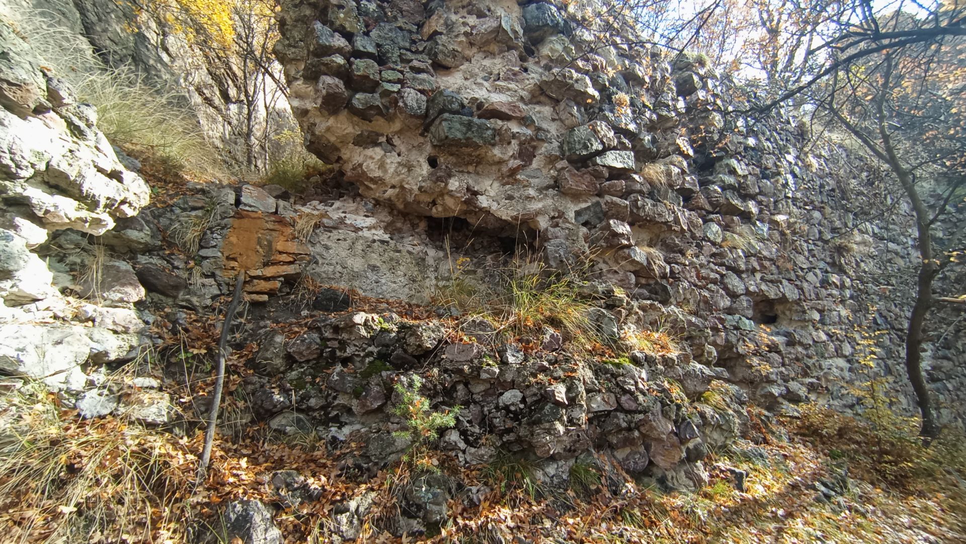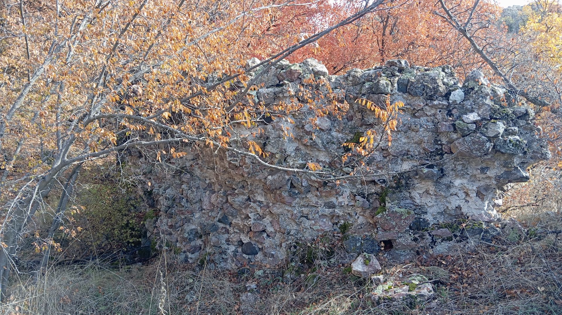 В рамките на около 5 минути се движите по ясна и широка горска просека. Достигате до място, където ясно се вижда как пътека се отделя вдясно от просеката и започва да се изкачва. След няколко минути сте пред голям запазен пасаж от крепостна стена с дължина около 25–30 м и височина между 4 и 5 м. В левия край на зида има процеп, през който може да се премине; тук има и каптаж и малка чешмичка, свързани с метална тръба. Това е мястото, откъдето можете да затворите маршрута на връщане.
