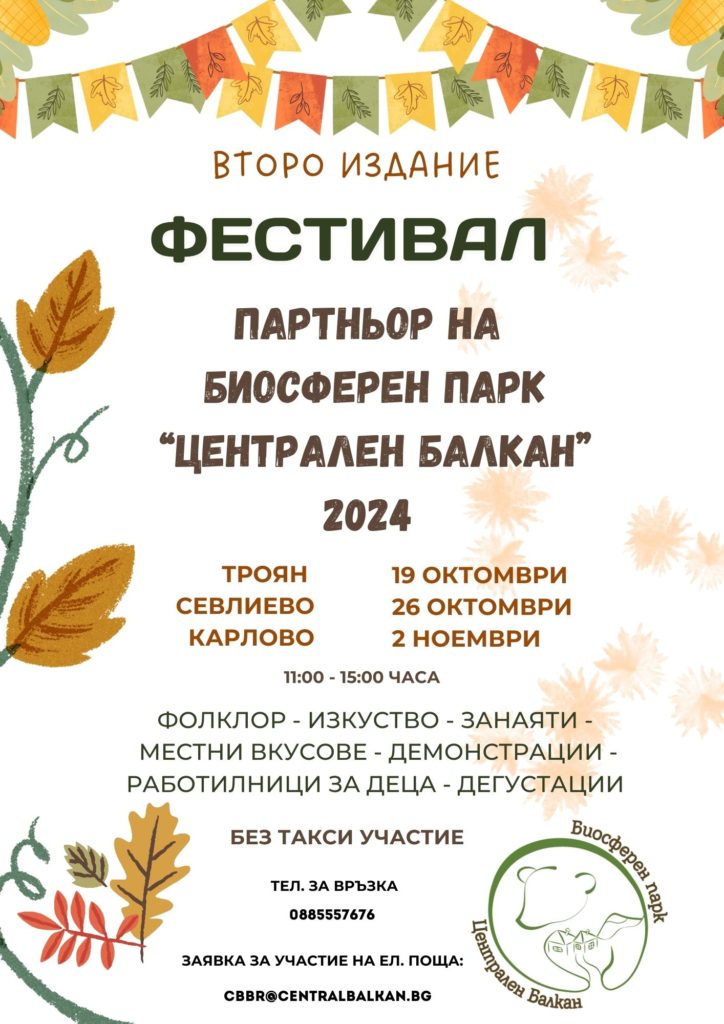 Ако вие сте занаятчия, производител на традиционни храни, напитки и други продукти, артист, творец или желаете да представите своята къща за гости, туристическа дейност, читалище, организация, атракция, които развивате в една от петте общини, принадлежащи към Биосферния парк – Севлиево, Троян, Павел баня, Карлово или Антон, заповядайте с щанд на Второто издание на Фестивала Партньор на Биосферен парк „Централен Балкан“.
