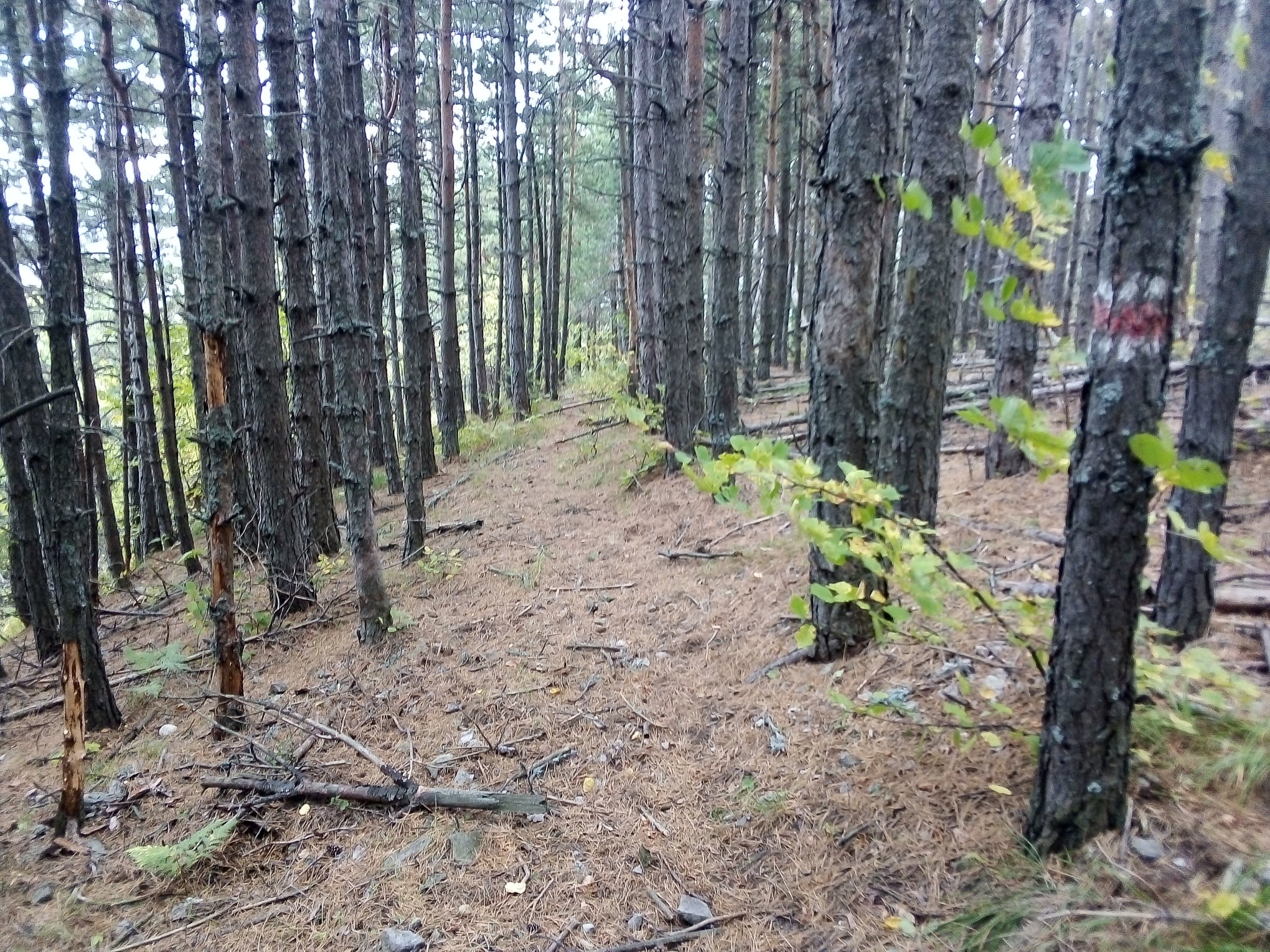 Заходих отдясно скалите, защото се оказа, че от ляво има непристъпни отвеси и изведнъж попаднах на стара избеляла табела. Тук пътеката (ако може да се каже така), завиваше в посока изток и започваше да се оформя много добре сред иглолистната гора (навремето засаждана изкуствено).