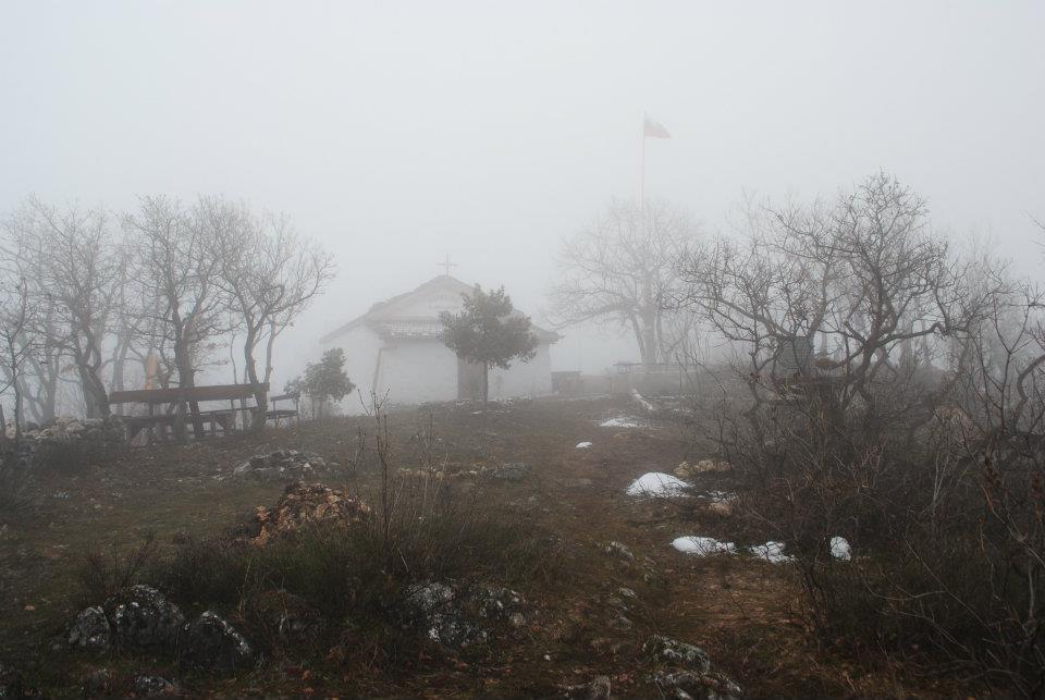Без почивка се качих на „Анатемата“, понеже всяка минута ми беше ценна. Прехода до този първи етап ми отне 45 минути. 5 минути почивка горе, където още снега на места беше до 40 см, а мъглата бе много гъста, и тръгнах към втория етап от моя преход – параклис „Св. Илия“ (наричан още „Гръцкия“), намиращ се на другия край на билото. Разстоянието е около километър и половина, което се взима обикновено за половин час, имайки се в предвид не особено лекия маршрут, по който се върви, а факта, че снега горе още си стоеше правеше доста тежко самото ходене.