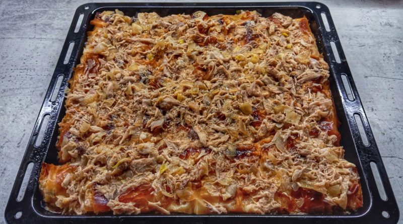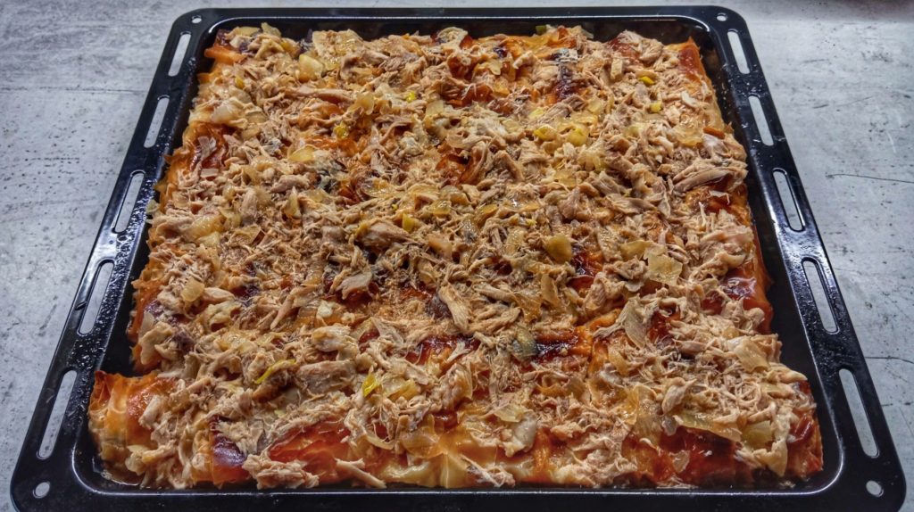 Сваряваме бутчетата и ги обезкостяваме. Накъсваме месото на конци. Запържваме каймата с една глава лук. Добавяме солта и червения пипер. Разстиламе корите в тавата, като ги намазваме с олио. Намазваме отгоре плънката от кайма и лук, след което завиваме. Слагаме да печем на 180 градуса до зачервяване.