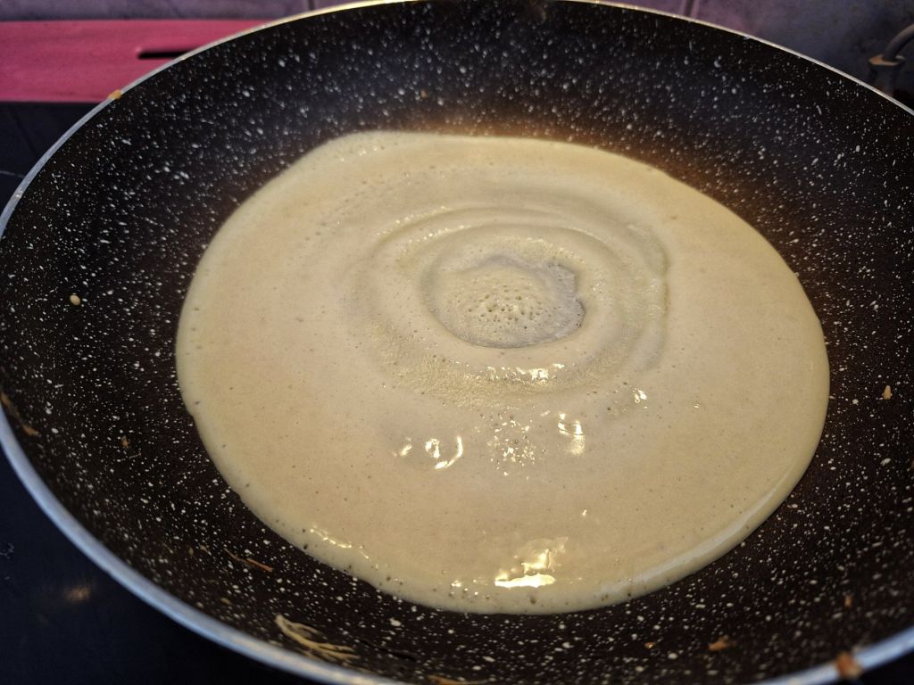 Загряваме тефлонов тиган на слаб до умерен огън (ако не е тефлонов, намазваме леко с масло). С черпак загребваме от сместа и я разливаме равномерно по дъното на тигана с въртеливи движения. Когато краищата на палачинката започнат да се повдигат, я обръщаме и изпичаме от другата страна до златисто.