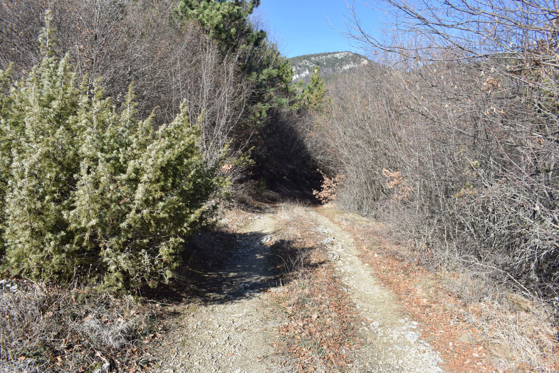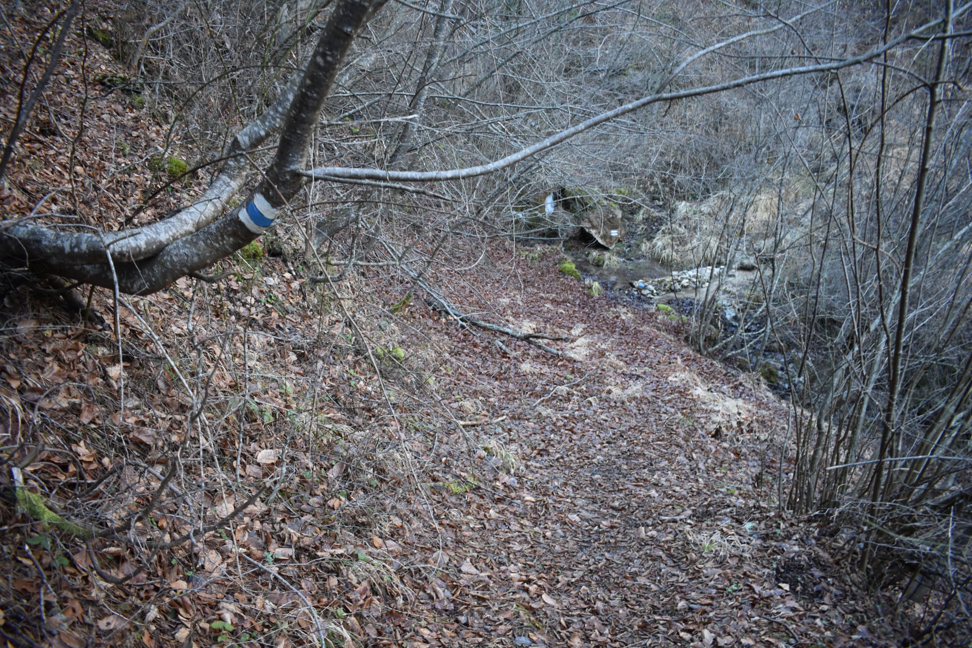 Изкачването ви продължава около 15 мин. В рамките на 600 м. отново се набирате височина. Вливайки се в почвен път, продължавате по него своето изкачване и достигате равно пространство. Поемате в ляво и не след дълго плавно се спускате до поредно дере, което пресичате.