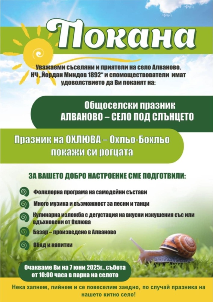 Общоселски празник и Празник на охлюва събират местни и гости в търговищкото село Алваново. Фолклорна програма, кулинарна изложба с дегустации и базар на изделия от местни производители ще съпътстват празничните прояви, организирани от Народно читалище „Йордан Миндов – 1892“ с подкрепата на дарители и спомоществователи.