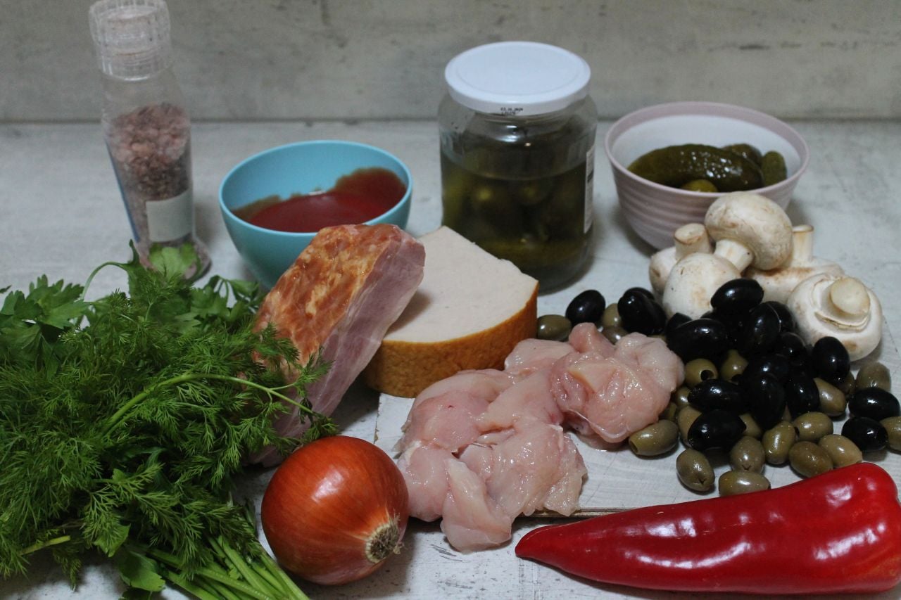 Основата на тази супа са колбасите, сокът от киселите краставички и маслините. Невероятно приятен кисел вкус и богат набор от месни аромати.