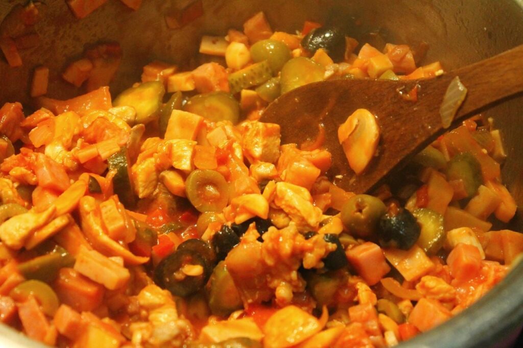 След няколко минути добавяме около 4 л. вода, в която слагате кубчета пилешки бульон, или ако имате готов пилешки бульон би било най-добре. Разбира се, може да сложите само вода. Солянката е рецепта, която търпи различни интерпретации и всеки може да отнема или добавя винаги нещо от себе си.