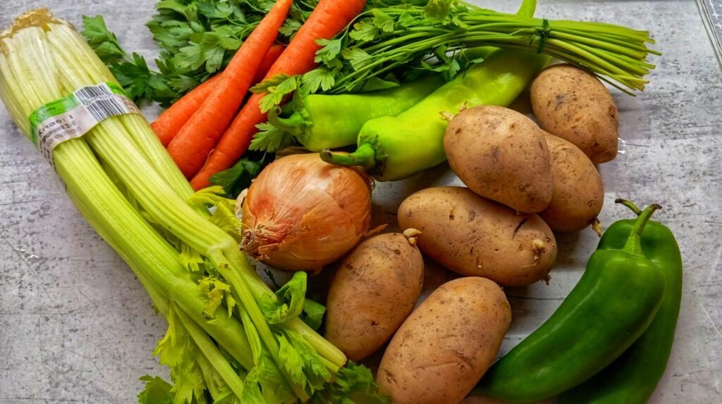 Запържвате месото, след което добавяте малко гореща вода и оставяте за около 20 мин. След това добавяте лука, картофите, морковите, чушките и стъблата целина. Добавете още малко гореща вода, намалете огъня. След около 10 минути добавете гореща вода, посолете с едра сол, може да използвате и 2 кубчета зеленчуков бульон (ако употребявате) и оставяте за около час време на слаб огън.