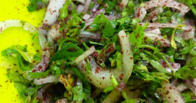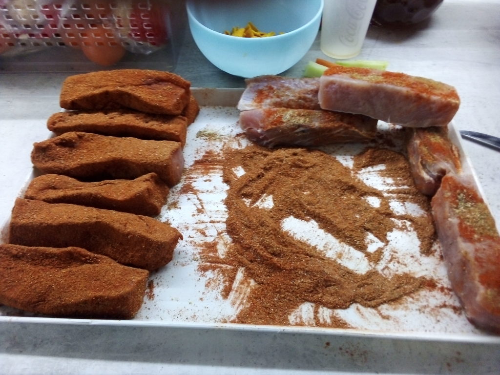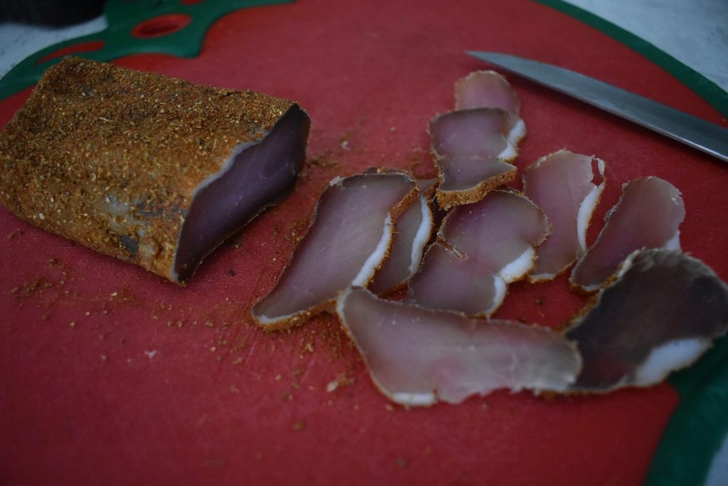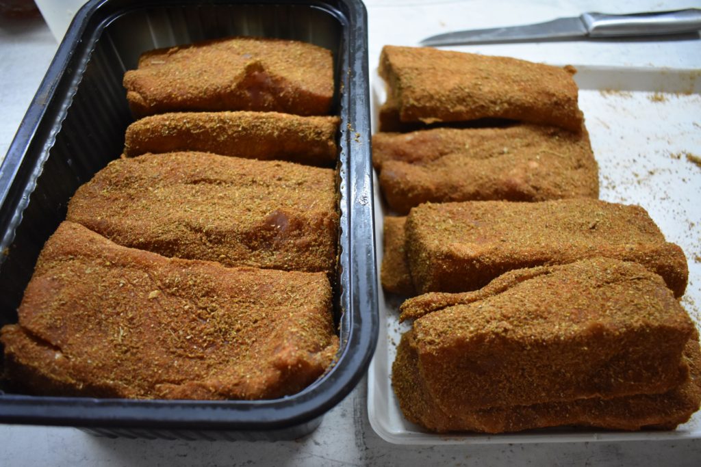 Правите харман от подправки – кимион, чесън на прах, сминдух, червен пипер, малко черен пипер (по избор). Овалвате добре и „простирате“ готовите парчета на сухо и по възможност проветриво място.