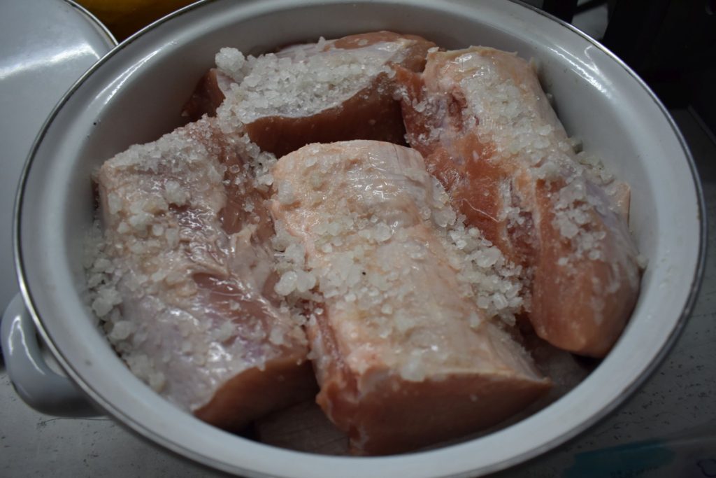 Взимате парчетата месо и ги нареждате в голям съд, като под всеки ред посипвате едра сол. След 24 часа измивате месото, подсушавате го добре и го нарязвате на парчета, по ваш избор и преценка. Важно е да се знае, че по-тънките парчета ще са готови буквално за ден-два, а по-дебелите за около 3-4.