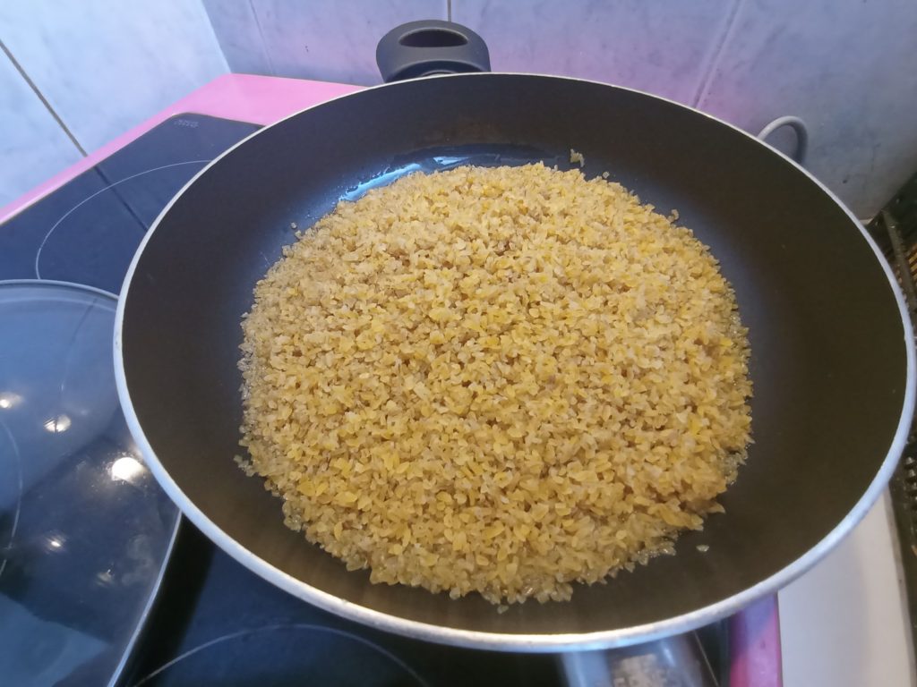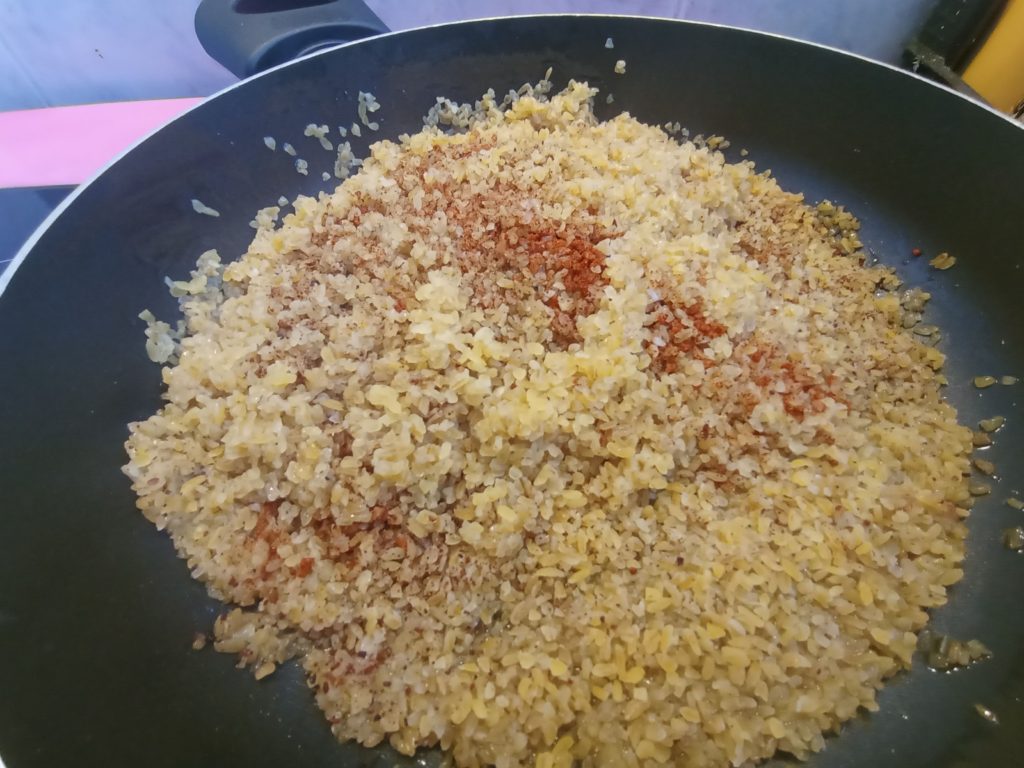 В голям тиган загряваме олио. След това добавям измития булгур (половин пакет – 500 гр.) и слагам подправки – червен пипер, сумак, кимион и сол. Количеството е според вашите вкусове, но бъдете сигурни, че колкото и да сложите, булгурът обича точно тези подправки.