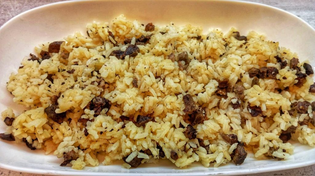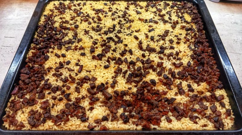 Измиваме дреболиите, нарязваме ги и ги сваряваме в осолена вода. След това запържваме ориза. Добавяме го в тава, смесваме го със сврените дреболии, доливаме с остатъчния бульон от варенето и слагаме в загрята на 180 градуса фурна. Печем около 1 час.