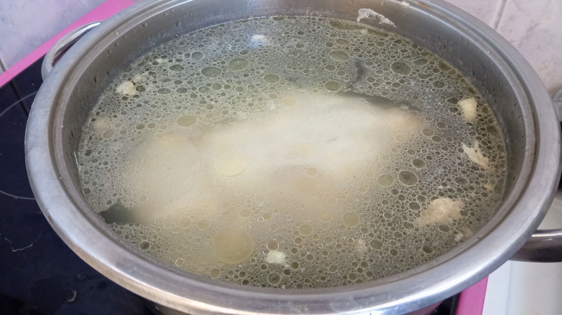 Месната част на супата може да е от бутчета, гърди или цяло пиле. Изборът е ваш и каквото и да изберете няма да сбъркате. Слагате вода, колкото да покрие месото и добавяте шепа морска сол. Варите пилешкото на среден огън, като в началото отпенвате, за да се получи чист бульон. Когато месото е готово, отцеждате бульона и обезкостявате месото.
