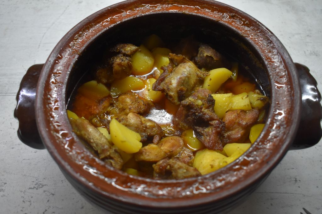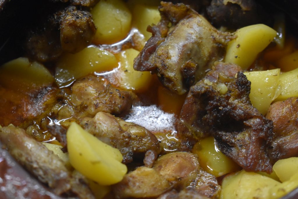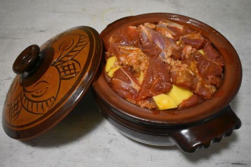 След като наредите, добавяте чашка (около 200 ml) вода. Слагате гърнето в студена фурна, след което пускате на 120 градуса. След 2 часа увеличавате на 180 градуса и оставяте за още час.