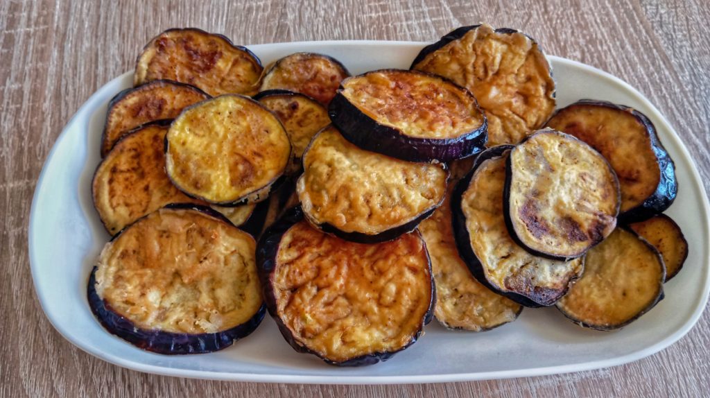 Нарязваме 2 или 3 средни патладжани на шайби с дебелина от 1 см и осоляваме. Правим това за да може патладжанът да „изплюе“ горчивината от себе си. След около час ги изплакваме и подсушаваме добре. По този начин те не абсорбират голямо количество мазнина в процеса на пържене.
