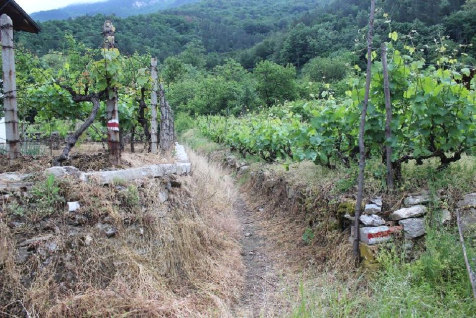 От крайните къщи, намиращи се в съседство до параклисите „Св. Петка“ и „Св. Трифон“ поемате по пътека, маркирана с червена маркировка. В началото тя се движи сред лозови масиви и овощни градини плавно набирайки височина. Достигате до дере, в което обръщате посоката на движение в дясно и започвате доста по-сериозно изкачване. Тук вече виждате и граничната (бяла и червена лента) маркировка, която ви указва, че се намирате в сърцевинната зона на Биосферен парк „Червената стена“.