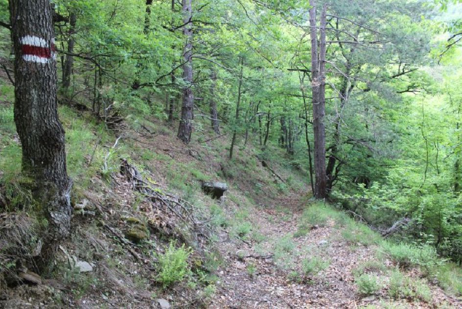 От поляната изоставяте югоизточната посока, по която сте се движили до сега и завивайки рязко на север, се движите сред широколистна гора. След около 500 м. достигате до чешма със старо дървено корито, която за съжаление е с нарушен дебит от няколко големи паднали дървета край нея. Все пак с повече търпение може да си напълните вода. От тук с леко изкачване пресичате две дерета, следвайки гънките на планината. През цялото време нямате гледка, но гората е стара и макар без панорами маршрутът създава усещане за простор.