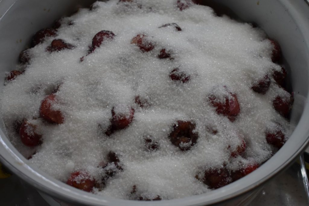 Измиваме добре черешите. Почистваме от дръжките и костилките. Засипваме ги със захар и ги оставяме за една вечер.
