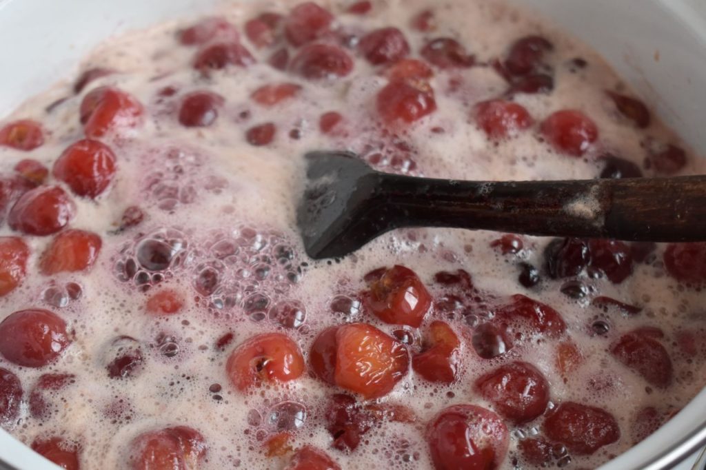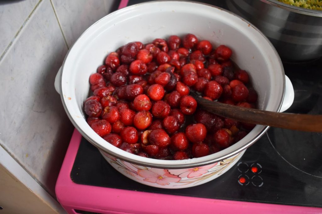 На другия ден добавяме вода и започваме варенето. Варим на бавен огън около 1 ч. Прецеждаме през ситна цедка съдържанието, добавяме лимотузу (ние добавяме половин пакетче, защото черешата е плод с подчертан кисел нюанс във вкуса и ако добавим повече, сиропът става твърде кисел за нашия вкус).