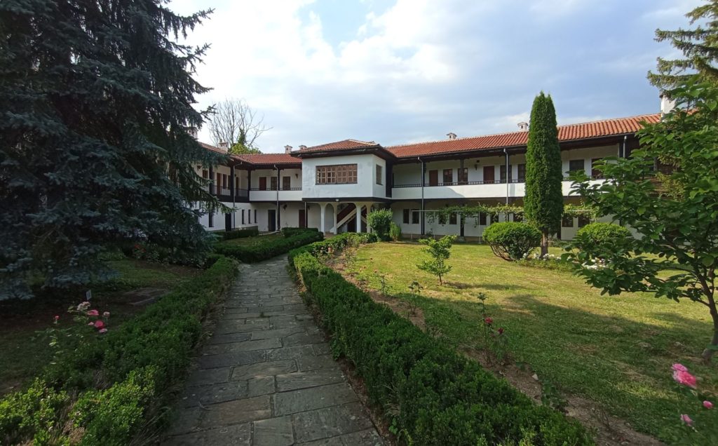 В средата на просторния манастирски двор, потънал в цветя и зеленина, ден и нощ ромоли уникална белокаменна чешма с осем чучура със соколи, за която се предполага че е построена през 1865 г. от майстор Колю Фичето.