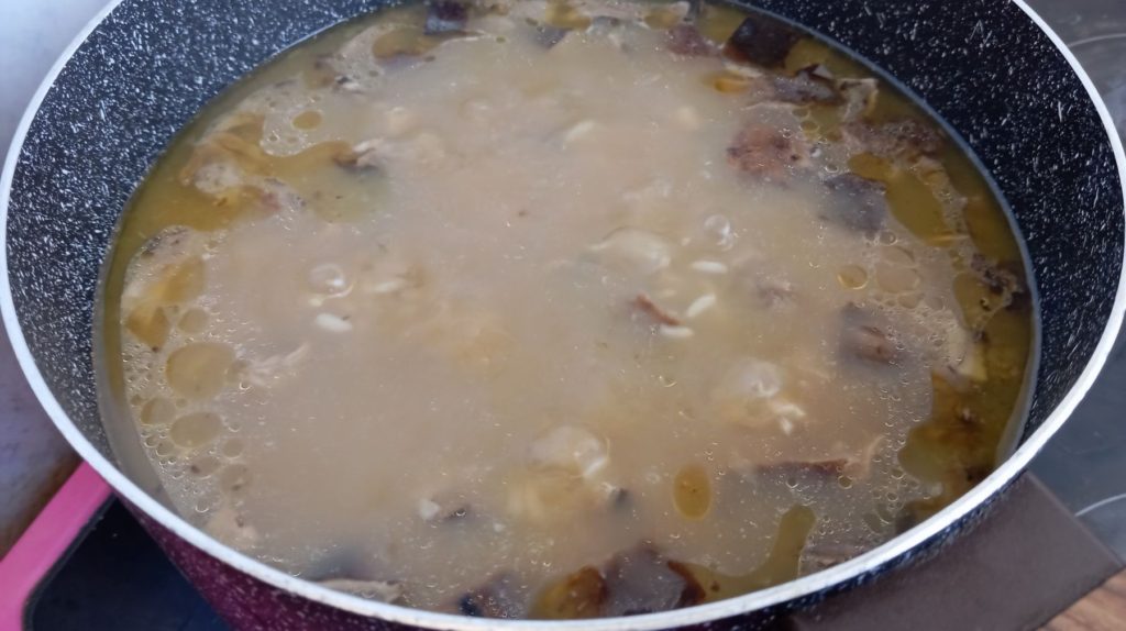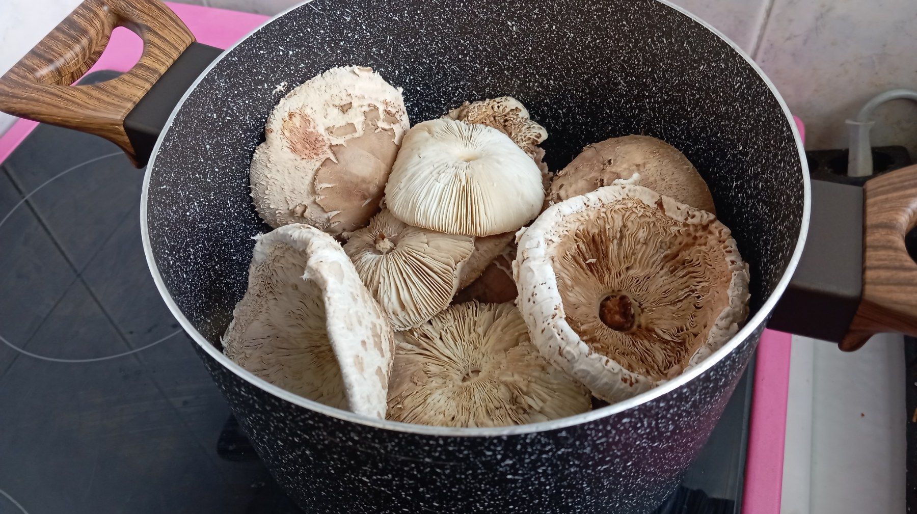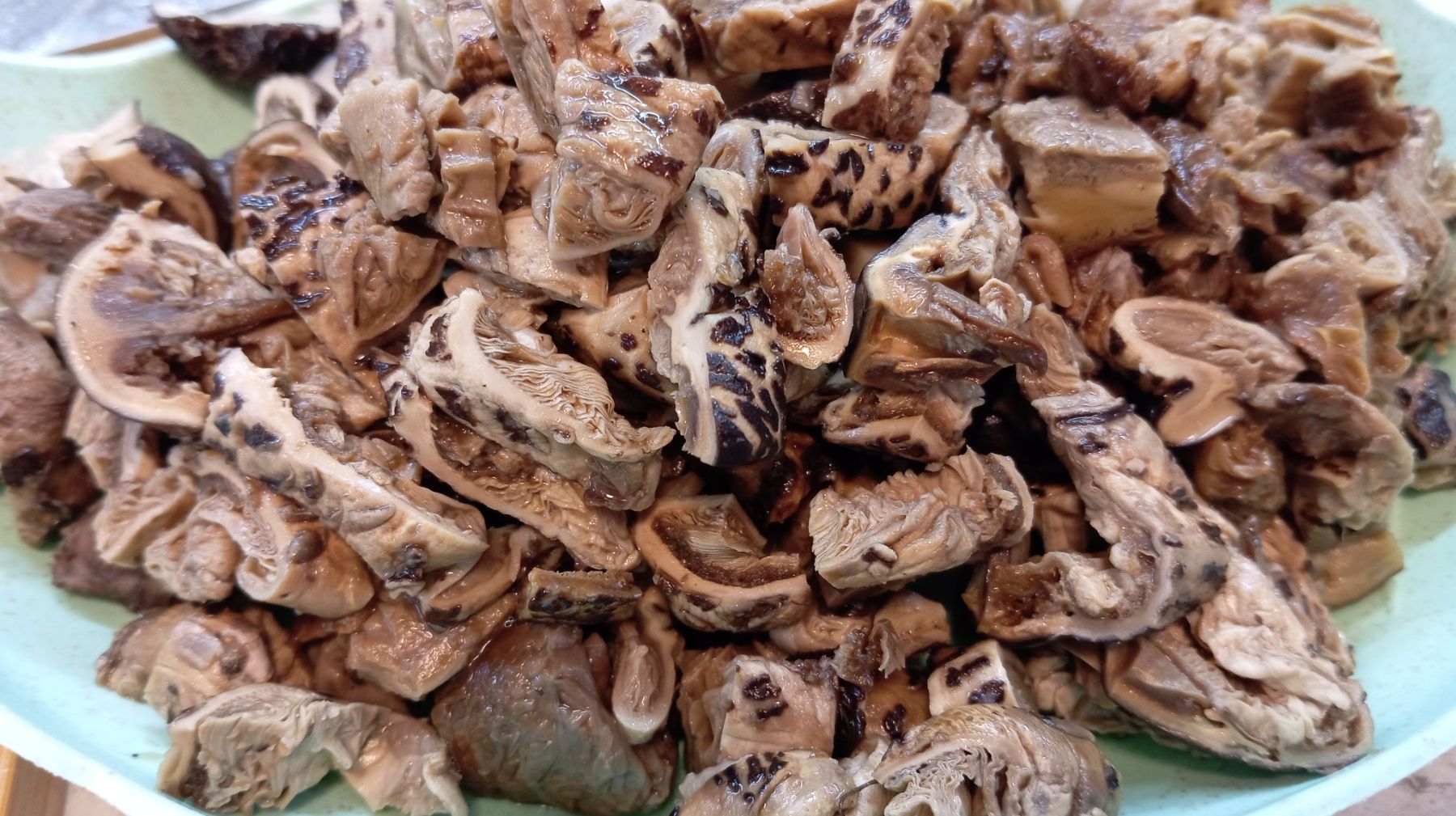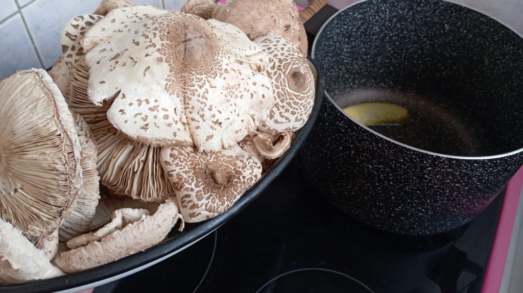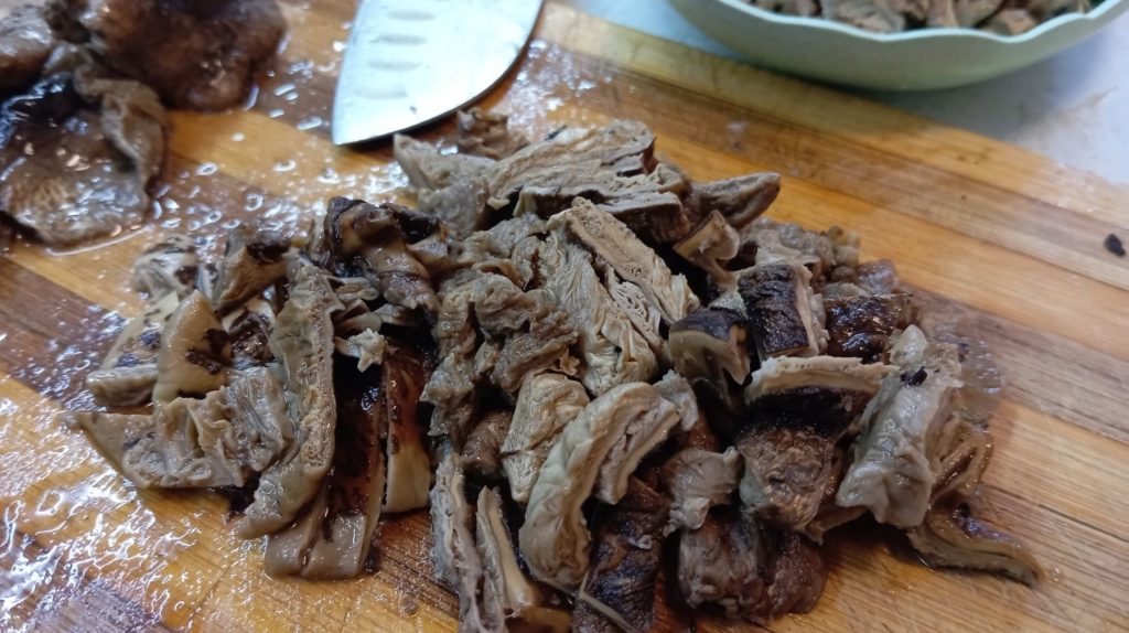 Спирате огъня и изчаквате гъбите да изстинат. След това се нарязват на малки късчета – 2-3 см.