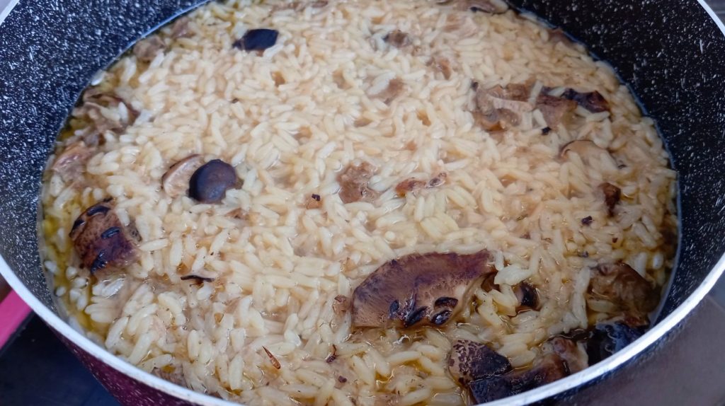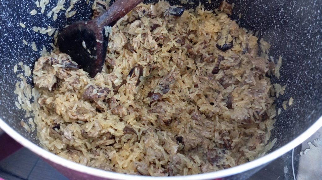 Отново слагате тенджерата, в която са се варили гъбите с остатъчната мазина и загрявате. Слагате нарязаните парченца сърнели и запържвате допълнително за няколко минути. Добавяте и ориза и разбърквате за няколко минути, за да може да го запържите в мазнината и ароматите на сърнелите.