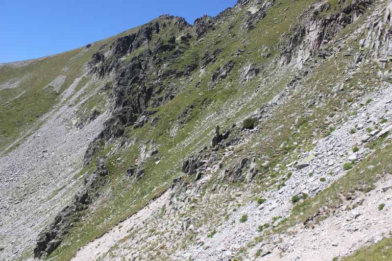 Слизайки в най-ниската точка между Малка Мусала и Иречек, пътеката става по-ясна и се движи на няколко метра южно от ръба. Отново преминавате край отвесни скали, но тук вече участъкът е далеч по-безопасен.