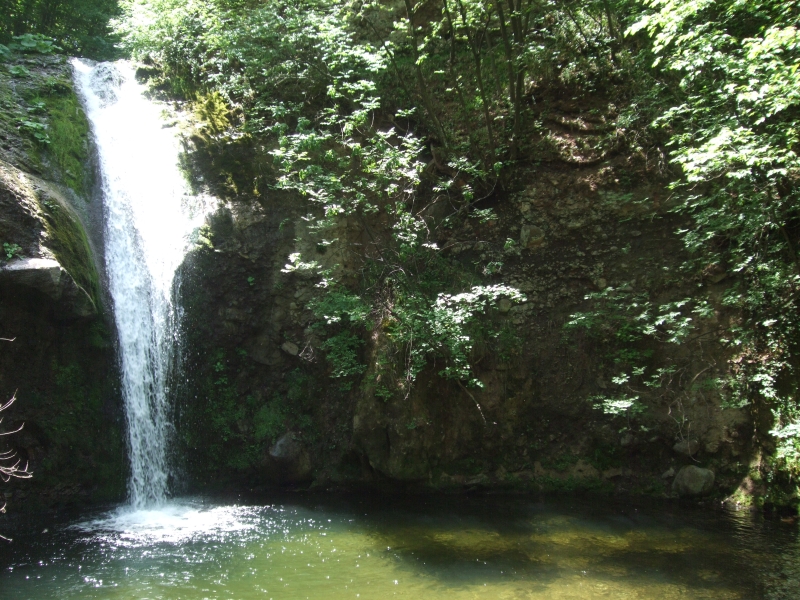 След около 500 м. се слиза до реката, но ние вместо да продължим надолу към водопада, решихме да повървим нагоре, и така след около 200 м стигнахме до местност, която Стойчо нарече „Пещрата“. Там имаше огромен скален отвес, пред който има обрасла с коприва и храсти стръмнина. Решихме обаче да се качим и след като стигнахме до горе се оказа че в самото начало на скалния отвес има площадка и то доста голяма и закътана. Много странно и интересно място. След десетина минути слязохме надолу по течението, по низ от малки водни каскади в изсечените от водата пролуки в каменното корито на реката. Намерихме място за пикник малко преди водопада, разтоварихме се и слязохме до „Водопада на лястовиците“. Пада на водната струя е около 10-12 метра, а слизайки до него (понеже има само един път до долу и то много стръмен), човек се чувства сякаш е някъде в Амазония. Препоръчвам горещо всеки който има тази възможност да го посети.