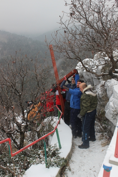 Организирахме се около 20 човека, за които обаче задачата не се оказа никак лека. Около 45 мин отне пренасянето на кръста, който тежеше около 150 кг. по 800-метровата отсечка от 3-тия км над Асеновата крепост до параклис „Св. Димитър“. Навалелия сняг и хлъзгавите камъни в съчетание с обраслите пътеки бяха допълнително изпитание. С много обща работа и подкрепа кръстът бе качен на мястото, което е воля на дарителя.