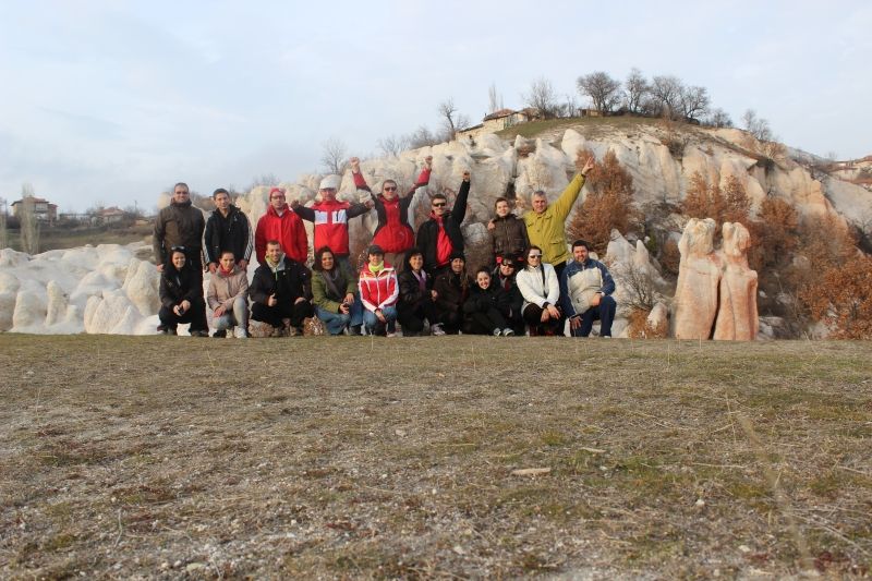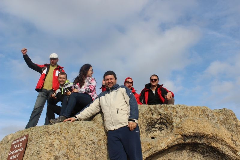 Оставихме колите в близост и продължихме около 200 метра пеша. Това нещо беше зашеметяващо. Природата се бе развихрила и във своето въображение бе нарисувала хиляди странни фигури, които наистина приличат на една огромна каменна сватба. Най-важната фигура са двете образувания, които са всъщност „младоженците“, които и виждате на снимката. Много въздействащо наистина. За да не бягаме от принципите си друснахме такова хоро на поляната пред феномена.
