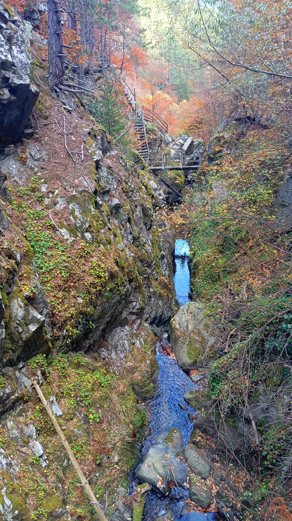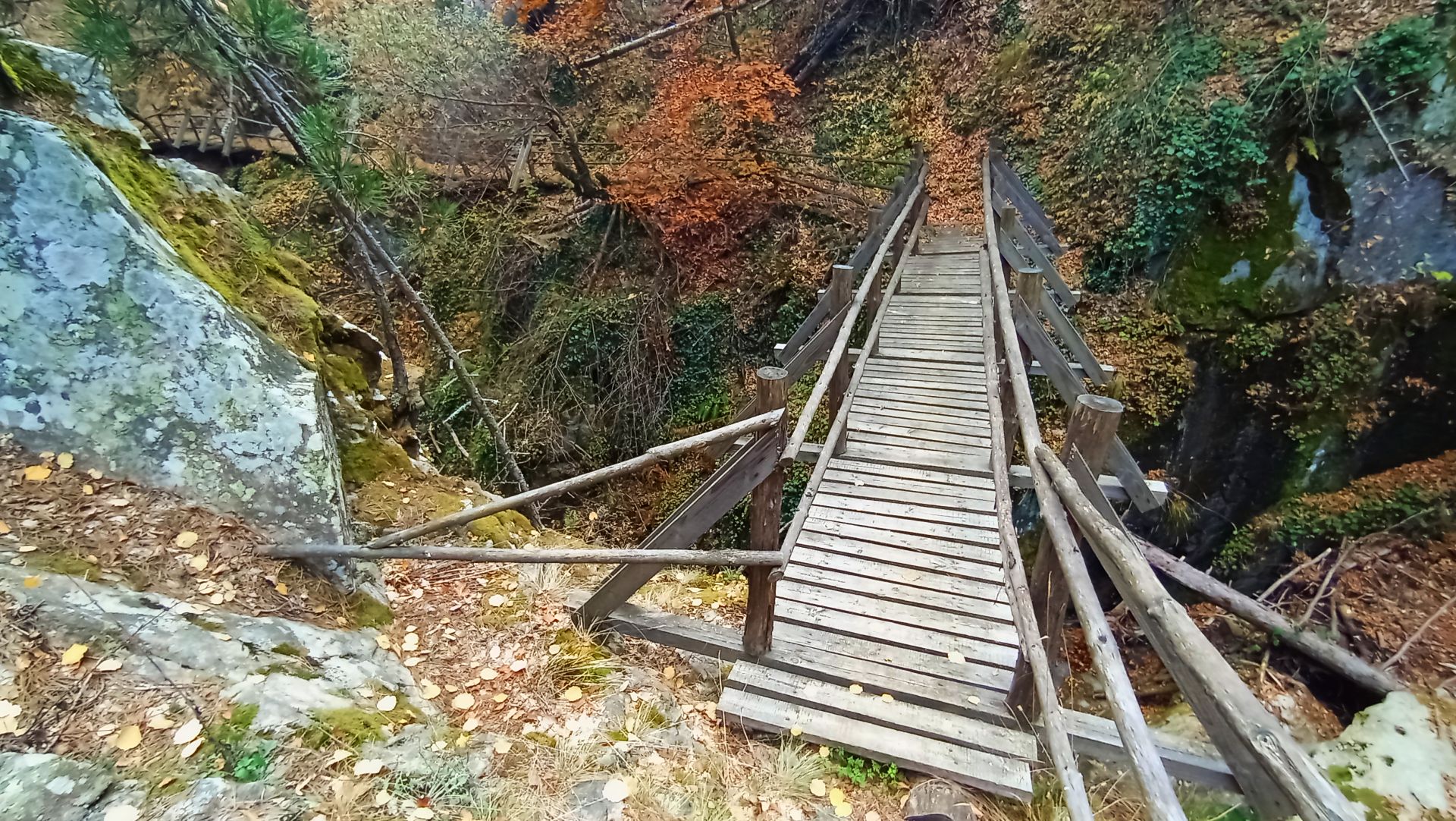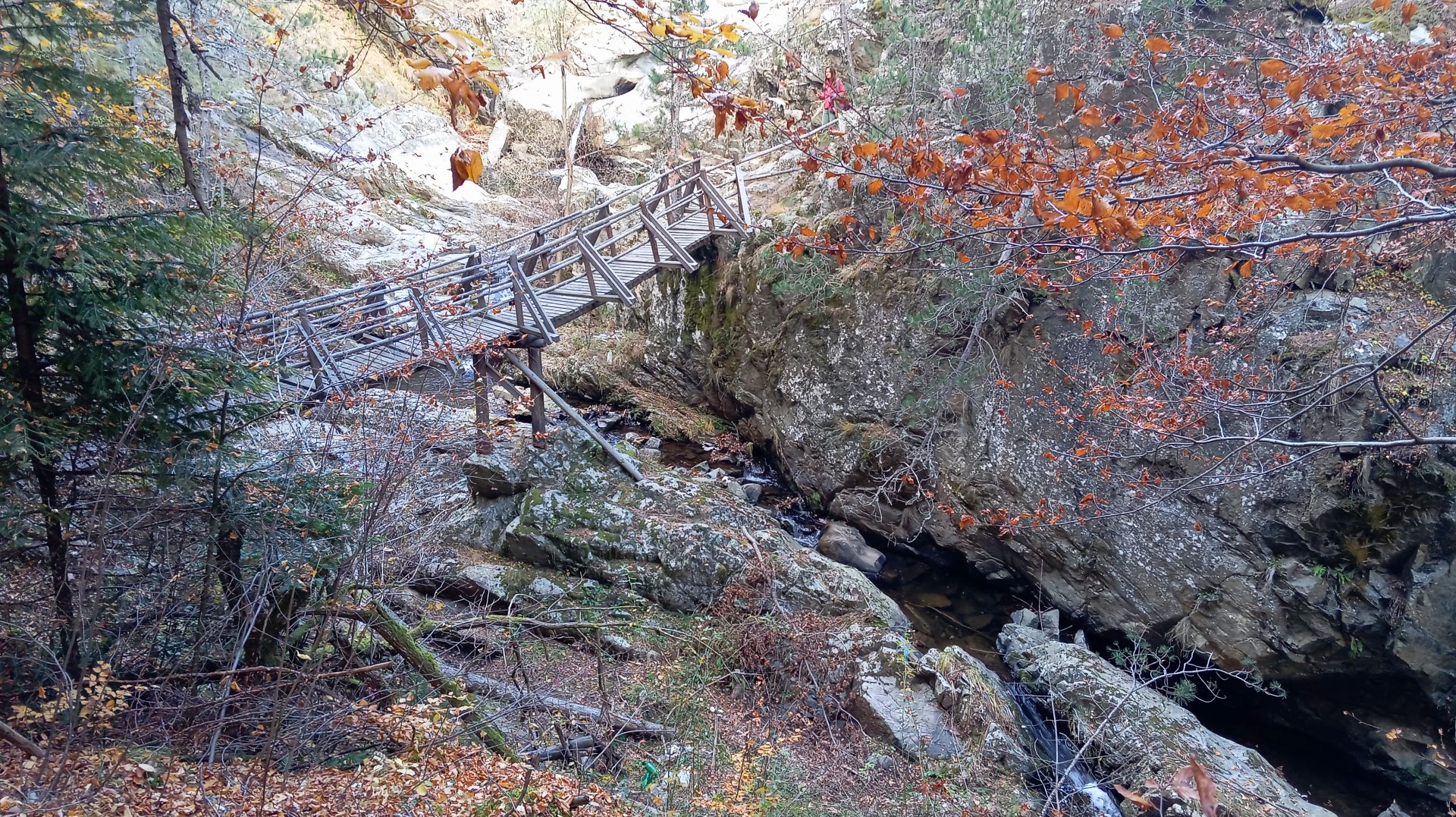 Започвате придвижване по пътека, която се спуска към реката и започва да „отваря“ очарователни гледки. След около 10 мин. пътеката се разделя на две, като вие хващате дясното разклонение, което води надолу по скалиста пътека сред борова гора. Не след дълго достигате до малък бетонен мост, който надкрачва реката. Тук ще видите две чешми. Едната долу, почти до реката, другата пред вас. Запомнете това място, може да се възползвате от него на връщане, защото зад чешмата започва пътека, белязана с оранжев спрей (стрелки и точки), която се движи над течението на реката и за около 20-25 мин. води до старинния мост в южния край на селото.